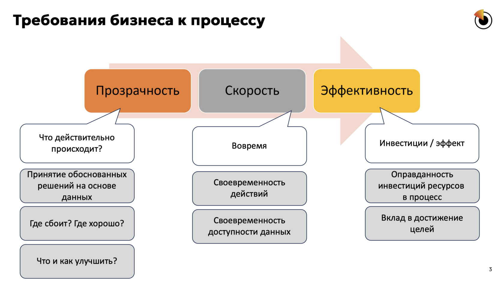 - Скорость. Под этим понимается не только сокращение времени и трудоемкости выполнения действий в рамках процесса, но и уменьшение затрат на получение, обработку и представление данных для управленческих решений. Иными словами, это запрос на своевременность — способность реагировать вовремя, принимать решения в нужный момент и действовать проактивно.