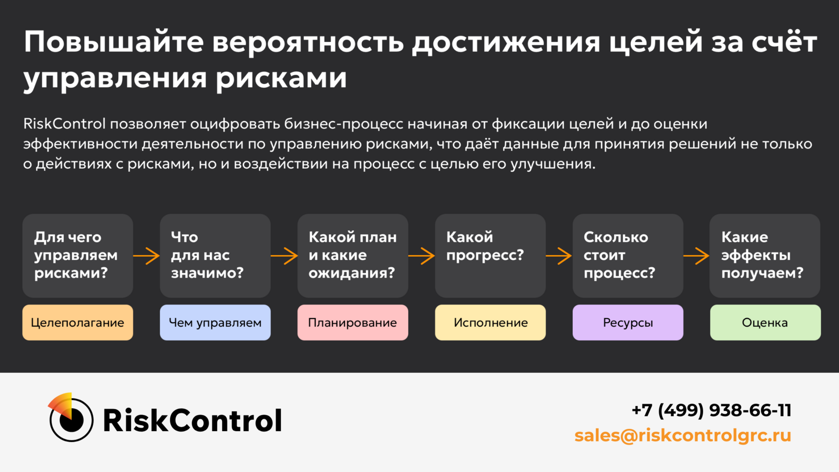COSO ERM — это не бюрократический инструмент, а философия управления. Система RiskControl была разработана с целью предоставить российским компаниям доступ к лучшим международным практикам, адаптируя их к реалиям отечественного бизнеса. Так, система RiskControl помогает пользователям видеть не только угрозы, но и возможности, принимать обоснованные решения и повышать устойчивость бизнеса к кризисам.